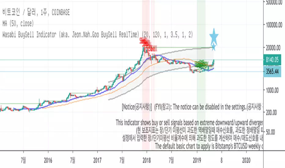 현 보조지표 "Wasabi BuySell Indicator (aka. Jeon-Nah-Goo 전.나.구. BuySell)"는 장/단기 이평선이 과도한 역배열일때 매수신호를, 과도한 정배열일 때 매도신호를 내고,