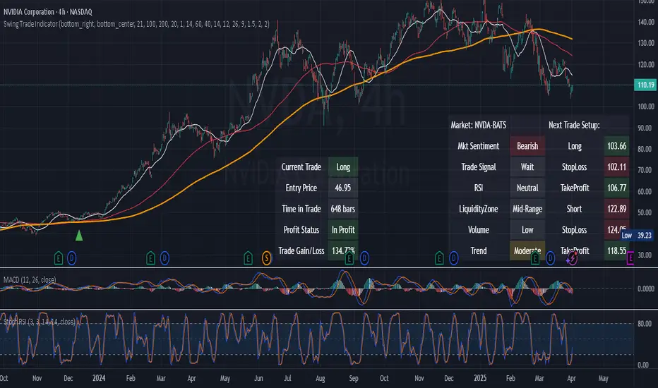 This is a Swing Trade Indicator that combines several technical indicators to analyze market conditions and generate trade signals. I've included two tables that provide real-time information to help you analyze the market and track trades: the Market Status Table and the Trade Tracking Table. These tables are overlaid on the TradingView chart and are customizable in terms of position and visibility.