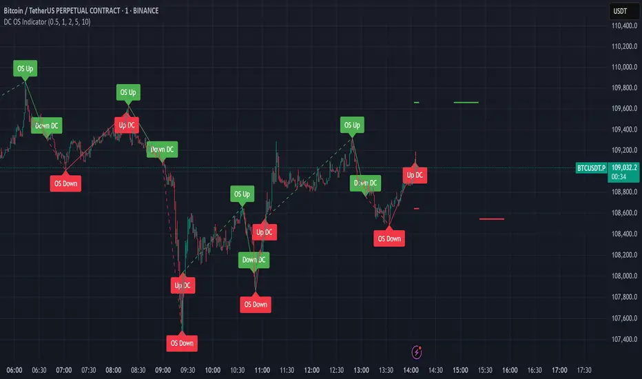WHAT'S NEW?- Next OS Price: Predicts the price of next OS. Draws a line 3 bars long at the average of OS length measured from last DC price. Time axis is repainted. Price can go beyond the line, meaning price goes above the average. Color is following OS color.