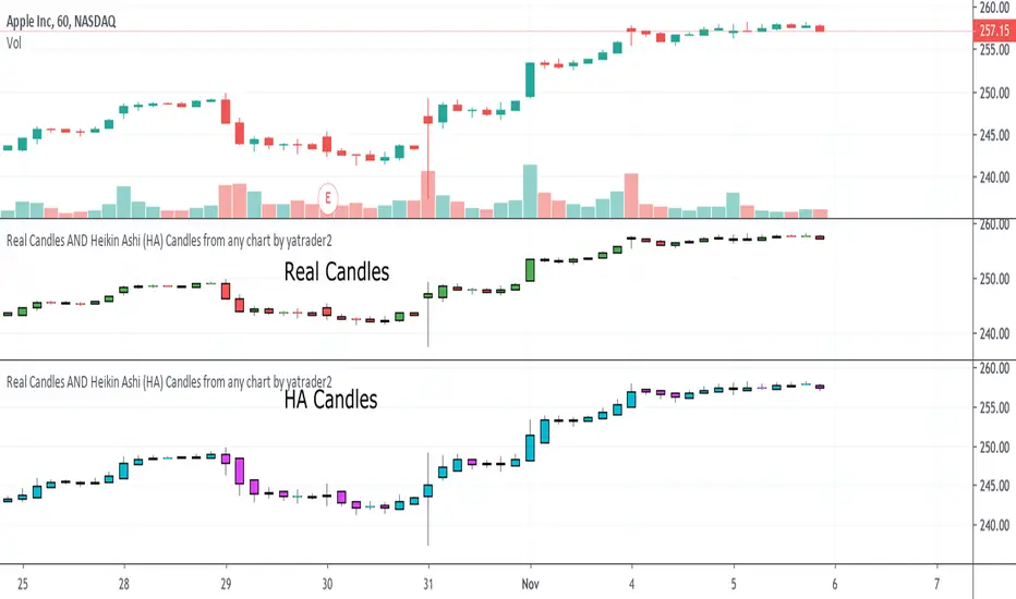 This script plots both real and HA candles regardless or which are used on the chart in TV settings.