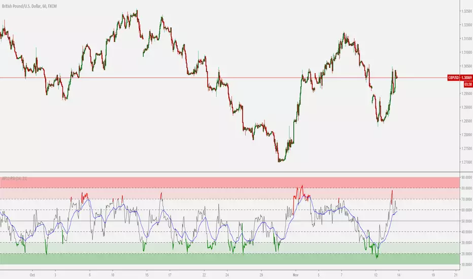 Color coded RSI to give a better indication of when to buy or sell based on the RSI level along with an included EMA signal to help describe the trend.