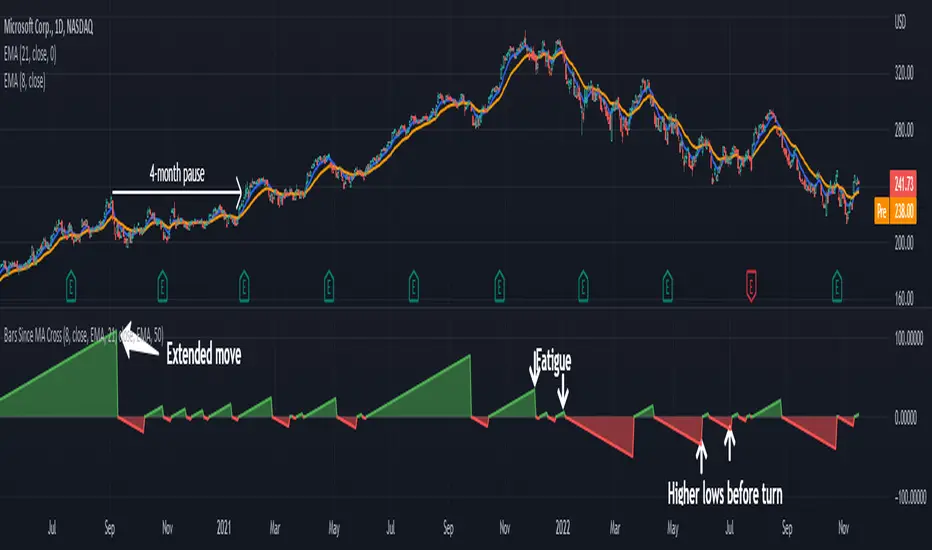 Bars Since MA Cross counts how many bars have passed since a fast-moving average crossed a slower MA. Bullish readings, with the faster MA above the slow, are plotted with positive numbers. The opposite is true for bearish conditions. Users can choose between simple, exponential and weighed average types. They can also mix them, comparing a fast EMA for a slower SMA, for example.