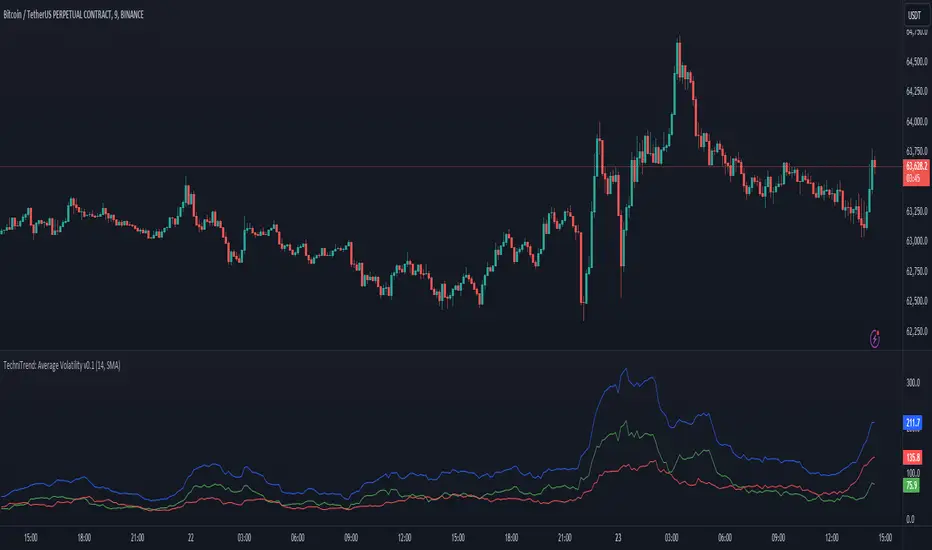 Description:The "Average Volatility" indicator is designed to provide traders with a comprehensive tool for measuring market volatility through three distinct types of volatility calculations: High to Low, Candle Body, and Candle Shadows. This flexibility allows users to gauge different aspects of price movement and volatility, offering a deeper insight into market trends. Additionally, traders can apply various moving averages (SMA, EMA, SMMA, WMA, and VWMA) to the calculated volatility values, making this tool adaptable to various trading strategies.