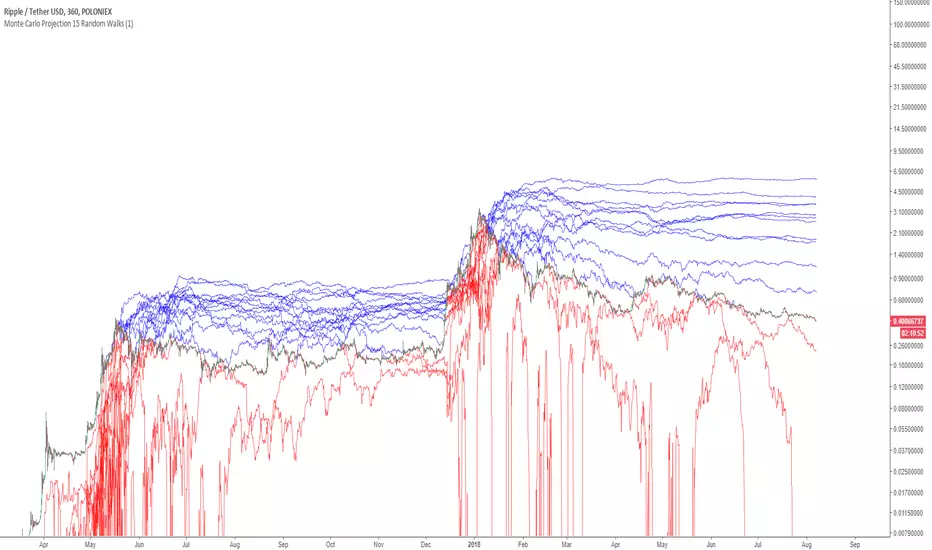 This indicator randomly generates alternative price outcomes derived from the price movements of the underlying security. Monte Carlo methods rely on repeated random sampling to create a data set that has the same characteristics as the sample source, representing examples of alternate outcomes. The data set created using random sampling is called a “random walk”.