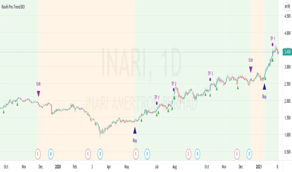 Buy, Take Profit 1,2,3 and Exit signals are included on chart based on the current Trend direction. The system shows an Exit signal if the system’s exit conditions are met. It works only on Daily Time-frame and on Closing Price.