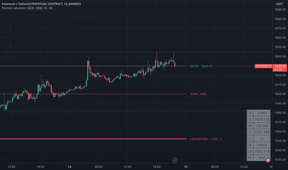 This indicator will help you calculate your position. This will automatically calculate potential liquidation price and select leverage for your stop loss and risk size.