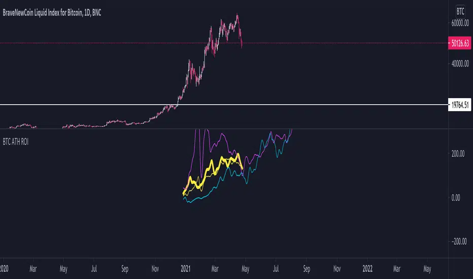 This indicator shows the ROI % of Bitcoin from when it passed its ATH of the previous bull cycle. I found it interesting that each time it crossed its ATH it took around 260-280 days to peak for each one. This bull run seems to follow between both of the previous bull runs including this recent dip.