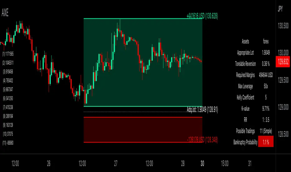 Auxiliary Equity Configurator (AXE) is a whole new level money management auxiliary that calculates statistically preferable lot based on the Account balance, Winning rate, Risk reward ratio, and Kelly multiplier configured a priori in the input panel.