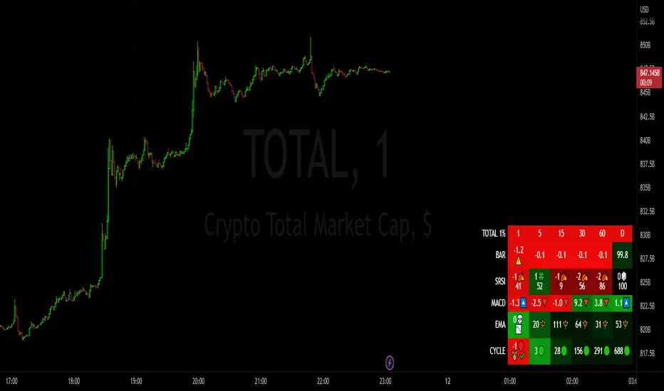 In V2 of this amazing indicator...!- Massive upgrade to increase consistency and quality of handling the indicator. Completely customizable rates for EMA, MACD, Bar Change Momentum, and indication for Cycles and Stochastic RSI. The idea is to consolidate all these different indications in percentage form to prevent having to switch between the many possible timeframes.