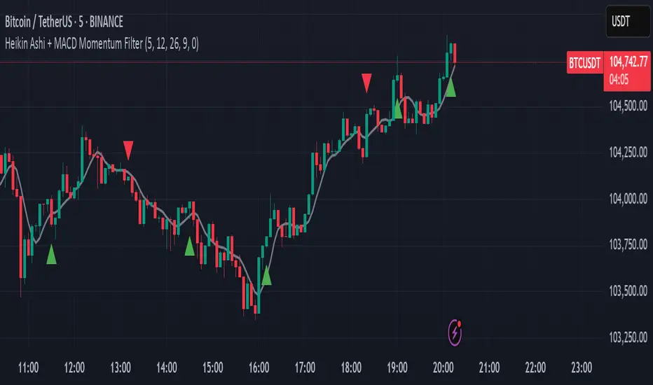 The Heikin Ashi + MACD Momentum Filter is designed for short-term and swing traders, combining the trend-smoothing capabilities of manually calculated Heikin Ashi candles with the momentum confirmation of the MACD histogram to generate reliable buy and sell signals. This indicator aligns trend direction with momentum shifts to minimize false signals, making it ideal for trading trending markets on timeframes like 5-minute to 1-hour charts.
