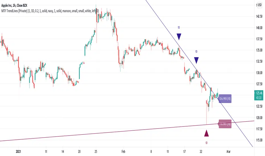 As the name suggests, the Multi-Timeframe (MTF) Trendlines indicator allows you to extrapolate trendlines from a higher timeframe into your chart timeframe. A maximum of one upper trendline and one lower trendline will be plotted per indicator instance. You can load multiple copies of the indicator into your chart and manually set each copy to operate in a different higher timeframe.