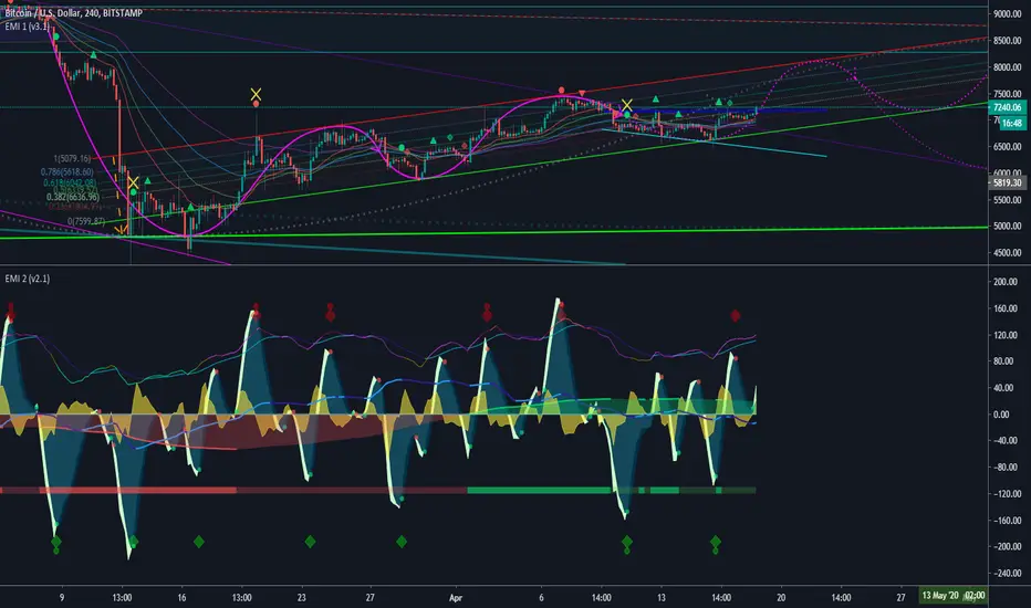 The signal conditions are based on different oscillators, known by many traders. ALWAYS wait for the candle to close and preferring even more confirmations before taking any consideration nor actions. No signals means most of the time trend continuation. EMI 2 in combination with EMI 1 and traditional authentic pattern formations with a darkened theme is recommended.