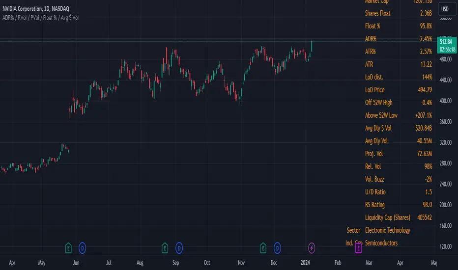 已更新 Swing Data - ADR% / RVol / PVol / Float % / Avg $ Vol