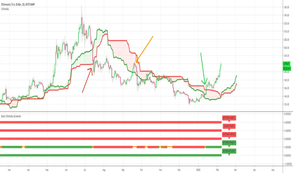This screener detects whether the price goes above, below or stays in between the Ichimoku cloud