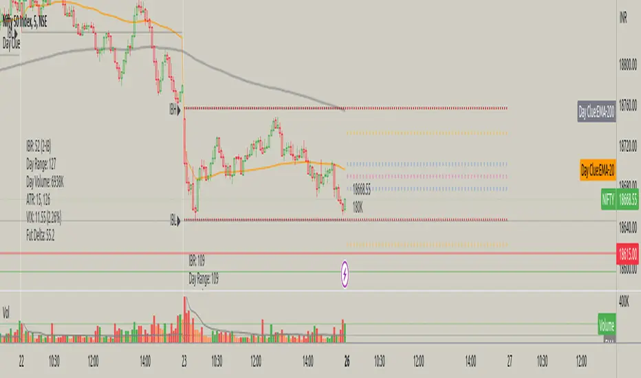Day Clue Indicator plots days information like "Initial Balance and Range", "Day Range", "Current Day Volume (for NIFTY and BANKNIFTY it takes the future volume)", "ATR", if the scrip is NIFTY or BANKNIFTY then it shows the difference between SPOT and Future price so that trader will come to know future is trading at premium or discount,it shows current day name at bottom right corner, and it plots the Ema-20 and Ema-200. These information will update during live market.