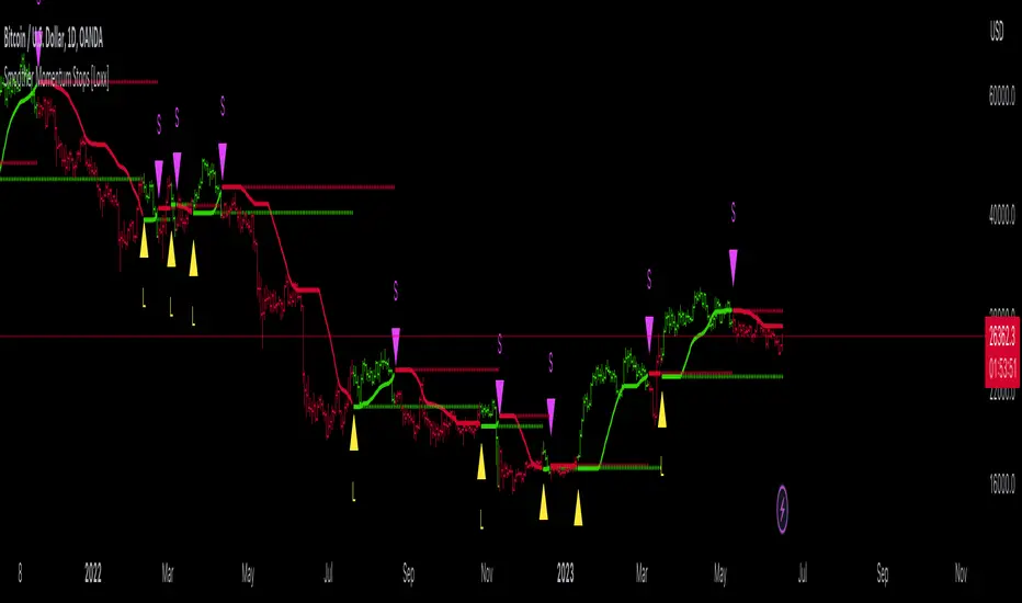 Smoother Momentum Stops (SMS) is a dynamic tool that combines the logic of momentum and moving averages to create an overlay of the market price and generate potential trade signals. The original idea for this indicator comes from the beloved and esteemed trading indicator guru Mladen Rakic.