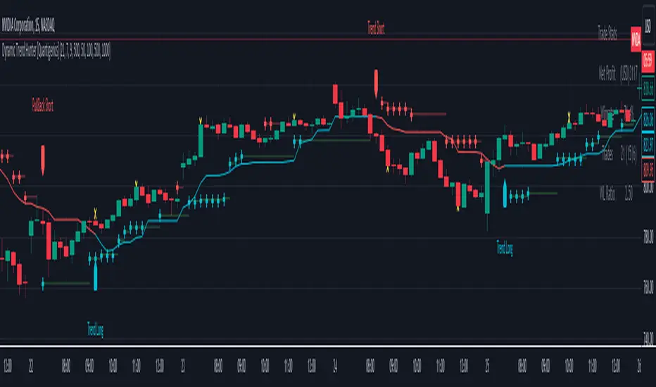 Dynamic Trend Hunter UPDATE With this update, we've continued to enhance our Dynamic Trend Hunter script. We've introduced the Trade Signal Calibrator, described below. Additionally, we've made improvements to the signals and the input settings. Please be sure to read through the entirety of the update to see all the improvements.