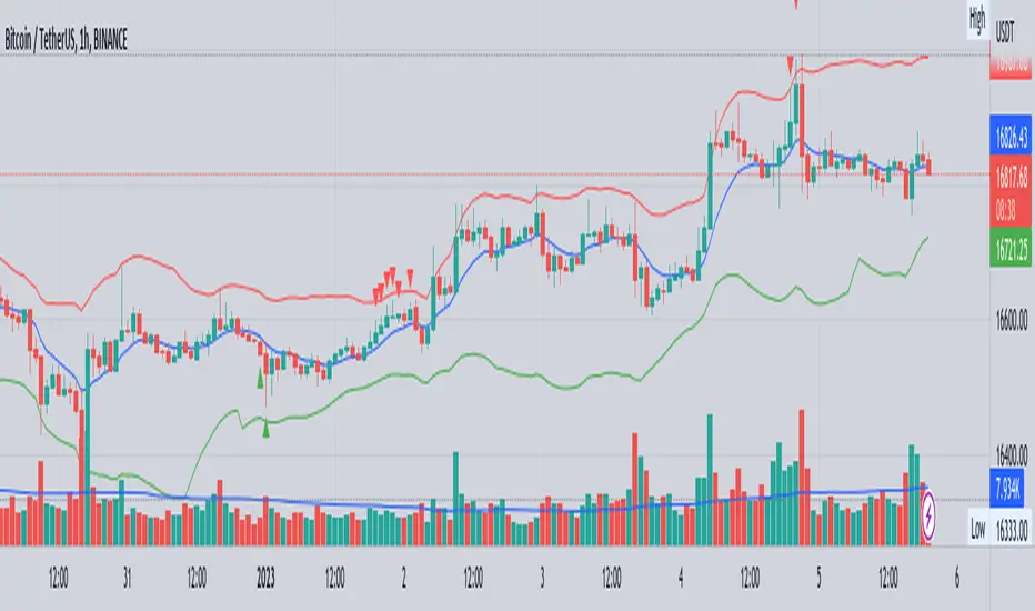 Trop Bands is a tool that uses an exponential moving average (EMA) as its central trendline and upper and lower bands to identify potential buying and selling opportunities in the market. The bands are calculated based on recent moves away from the EMA, and they are plotted around the central trendline to provide a visual representation of market trends and conditions. When the price moves outside of these bands, it can be seen as a signal that the security is overbought or oversold and may be ready for a reversal, just like Bollinger Bands.