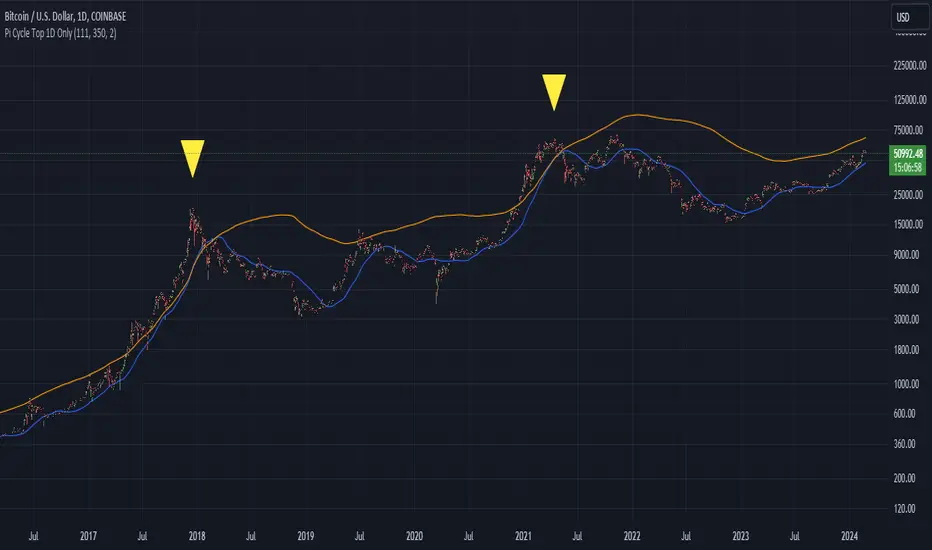 The key premise behind the Bitcoin Pi Cycle Top Indicator is that a potential market top for Bitcoin can be signaled when the 111-day MA crosses above the 350-day MA (which has been doubled). Historically, this crossover event has shown a remarkable correlation with the peaks of Bitcoin's price cycles, making it a tool of interest for traders and investors aiming to anticipate significant market shifts.