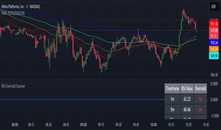 Visual Output: Displays a table in the top-right corner showing RSI values and oversold status ("Yes" or "No") for each timeframe, making it easy to verify conditions.