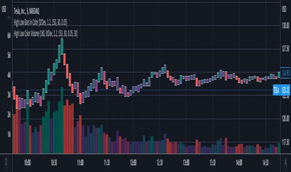 High Low bars de-emphasize open and close levels, but sacrifice color. Because traditional candles use open and close to determine color, a new approach was needed. This script uses change in midpoints between high and low ( hl2 ), with degrees of shading based on threshold levels in the settings. The default threshold is 1.2 standard deviations of the change in hl2 .