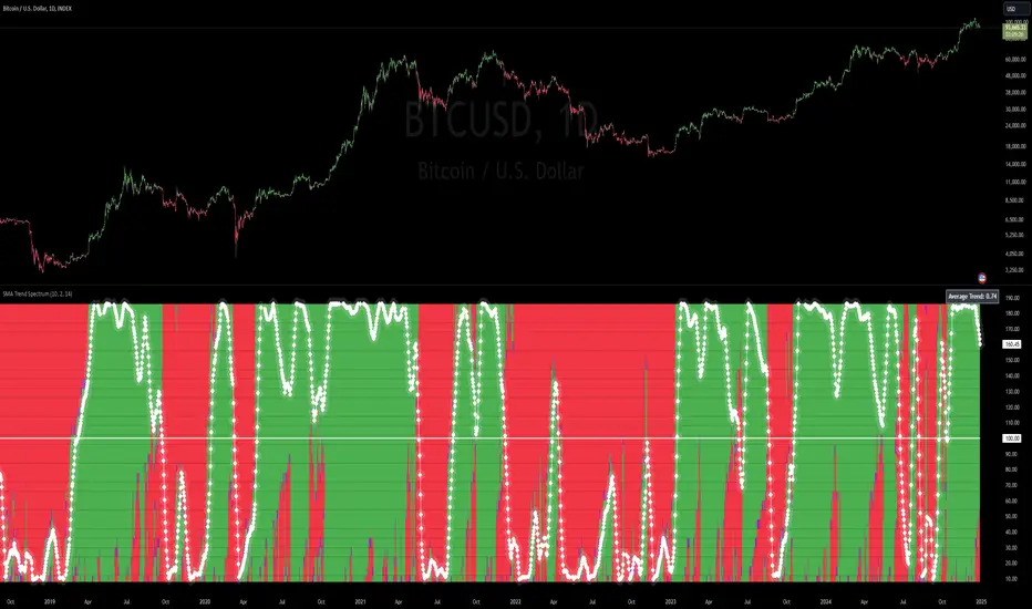The SMA Trend Spectrum indicator is designed to visually represent market trends and momentum by using a series of Simple Moving Averages (SMAs) to create a color-coded spectrum or heatmap. This tool helps traders identify the strength and direction of market trends across various time frames within one chart.