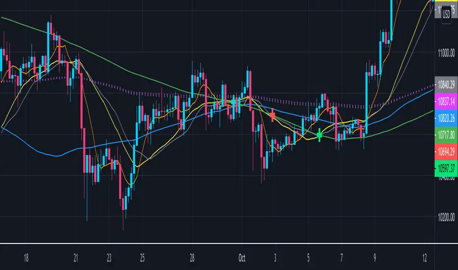 This is an indicator that includes several EMAs and MAs (Used in Cryptotrading).
