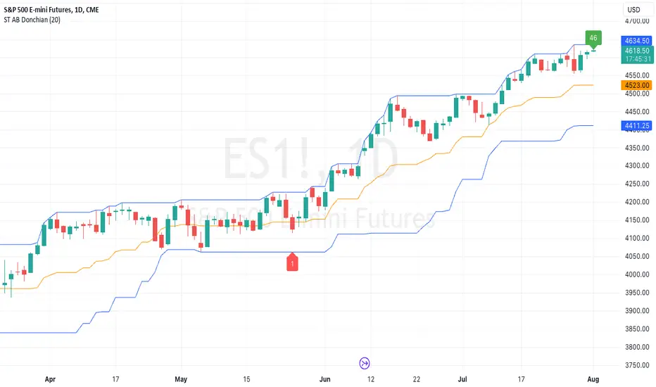 "Bars Above/Below Donchian Channel" provides a visualization of the Donchian Channel and measures the number of bars above and below the middle line of the channel.