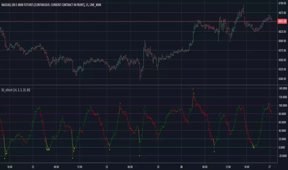 B3 Extended Stochastic ~ This is my personal take on the standard "Stochastic Full" study that most platforms natively carry. However, this is slightly more powerful. The simple difference is that in a normal stochastic indicator, 0 and 100 are the minimum and maximum values. Here there is no min/max, hence the title "Extended Stochastic." When extended beyond 0 or 100, this tells you if you're expanding range (breaking out), and often the stochastic turns that are beyond the 0 or 100 lines tend to be more juicy than normal stochastic overage turns. There is still the classic 20/80 over-lines, and they still carry their full validity in this script. Think of extended range as additional information and not a remaking of the indicator. You will find it quite successful in oscillation, but as always, oscillators struggle in long running trends.
