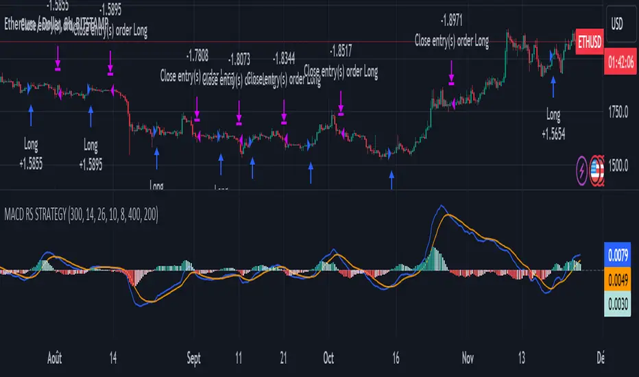 This strategy is based on two well-known indicators: MACD and Relative Strenght (RS). By coupling them, we obtain powerful buy signals. In fact, the special feature of this strategy is that it creates an indicator from an indicator. Thus, we construct a MACD whose source is the value of the RS. The strategy only takes buy signals, ignoring SHORT signals as they are mostly losers. There's also a money management method enabling us to reinvest part of the profits or reduce the size of orders in the event of substantial losses.