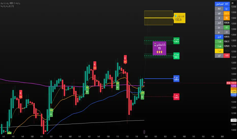 مؤشر تجميعي ذكي يوازن بين الاتجاه والزخم والحجم والتذبذب وأنماط الشموع، ويحوّلها إلى نظام نقاط ونجوم يولّد إشارات شراء/بيع مؤكَّدة بتقاطع MACD. بعد الإشارة، يعرض أهدافًا ذكية (TP1/TP2/TP3) ووقف خسارة مبنيَّيْن على ATR مع رسومات مستقبلية ولوحة معلومات لإدارة الصفقة.