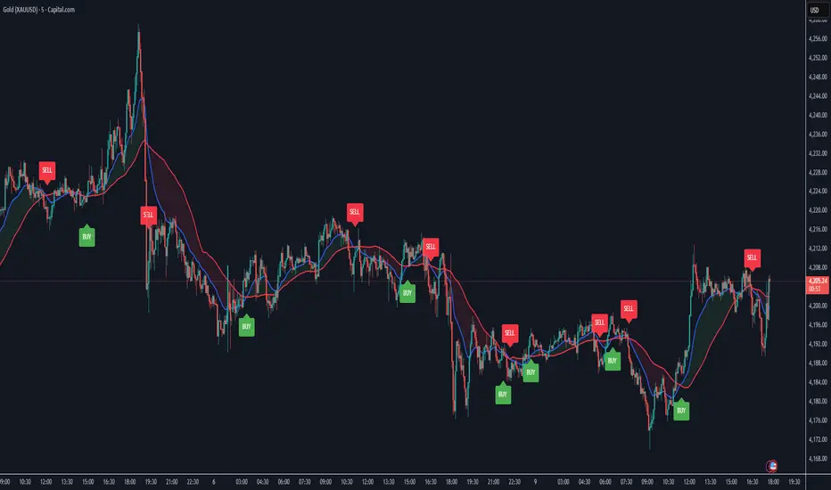 This indicator signals BUY or SELL entries when the Fast EMA crosses the Slow SMA.