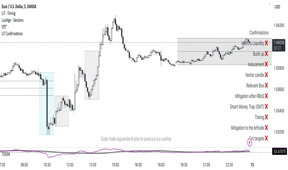 The LIT - Confirmations Indicator is a dynamic checklist tool designed for traders who uses LIT Strategy (Liquidity Inducement Theory) following liquidity and smart money concepts as benefit. This tool allows users to document and track essential trading confirmations directly on their TradingView charts, offering a structured and visual approach to market analysis.