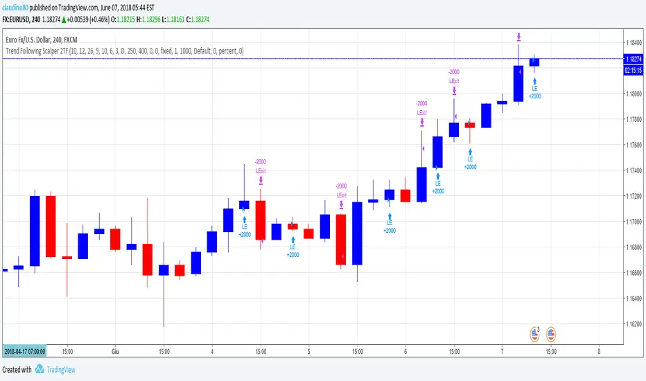The Trend Following Scalper (2 Time Frames) script has been developed to automate the trading activity by detecting a new trend and by scalping a fixed amount of pips each trade. That is why it is called Trend Following Scalper.