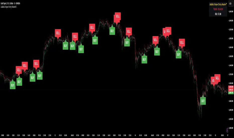 It combines trend structure, momentum pressure, RSI confirmation, and non-repainting crossover logic to produce extremely precise sniper entries.