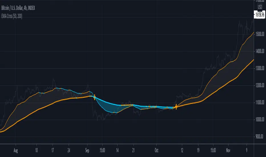 Color coded Fast & Slow Moving Averages. Cross printed at MA cross. MA color changes when price moves above / below MA.