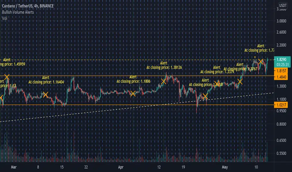 Simply labels out and alerts you when three consequently higher volume bars appear, pretty useless on its own but for crypto, it works great to quickly notice if some important fundamentals suddenly cause the price to rocket. It works best with hour timeframes. Personally I'd use it with 4h.