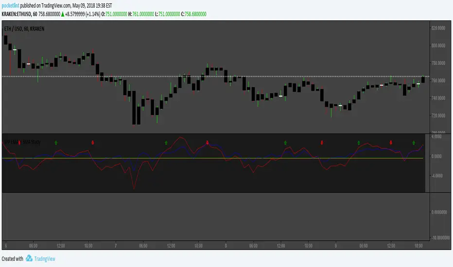 So I took an idea from various scripts out there that fcus on EMAs, EMA Ribbons, SMAs, including gains. The idea behind this is to eliminate excess noise by cross referencing values from both SMA and EMA in a more competitive environment. What this does is provide the trend determined by EMAs while using a SMA gain to cut out the fluff so to speak. Works good on multiple coins but is not supported by backtesting since I have not completed the Strategy script as of yet. Currently using this for 1h timeframes on ETHUSD coin in Kraken's exchange. As usual it's all open source and free. Enjoy! Friendly with autoview.