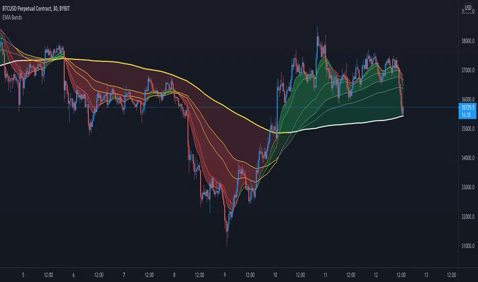 EMA Bands for crypto markets shows support and resistance lines. Helps identify bull and bear market trends. SMA200 is white and turns yellow to signal pressure. Can also be useful for identifying Elliot waves and breakouts.