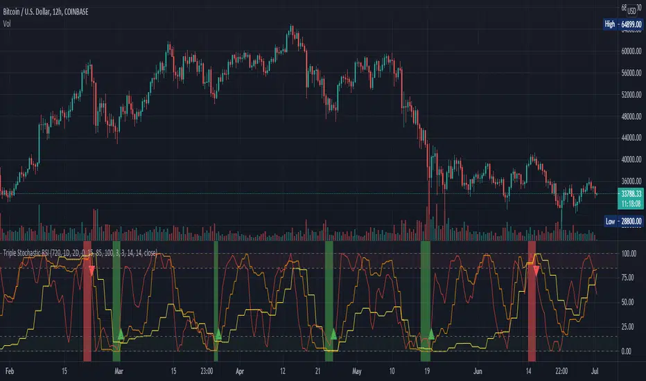 As the name suggests, this indicator is a combination of three stochastic RSI indicators on three different time frames.