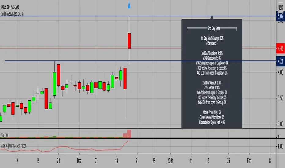 What happens after a strong day 1 move? Use the custom input to test, what happened after a 10% move on day one. Change the day 1 move % and the number of years to backtest. It's that simple. The tool is especially helpful for small-cap traders and for stocks after earnings.