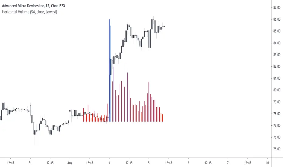 Plot the last length volume observations horizontally on the price graph by using rescaling, with a position relative to the price highest, lowest, or moving average. Note that the indicator is subject to repainting.