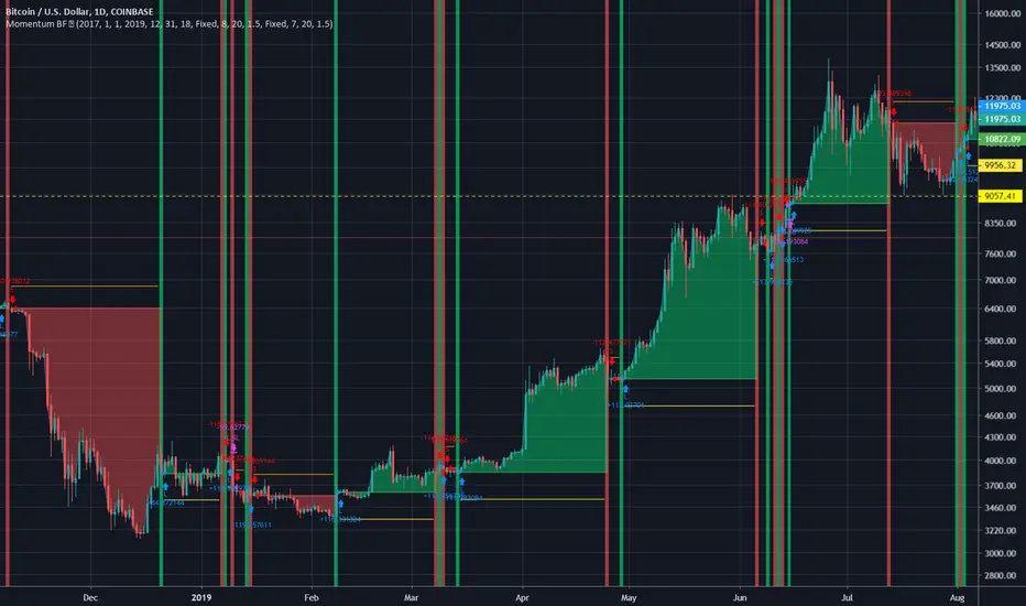 The momentum strategy is simple, if price action is higher than it was for x bars back, and also higher than it was last candle, we have upwards momentum. This momentum will be positive until a candle closes lower than the previous candle and also lower than x bars back - at which point we have downwards momentum.