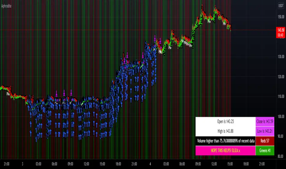 // volume accumulates when dots are green for buys, red for sells. This setup is just looking for buys but this is very easy to change