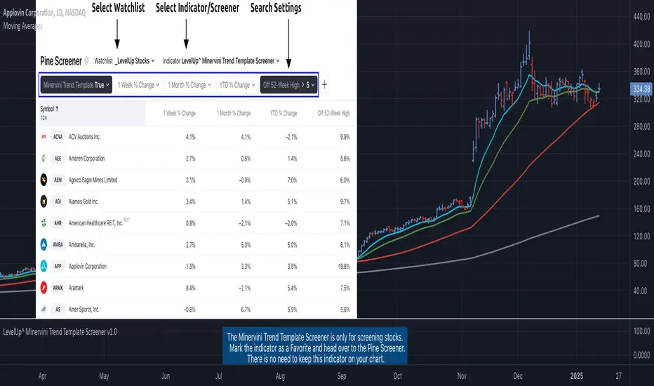 The Minervini Trend Template is a stock screener based on the work of Mark Minervini, a two-time winner of the U.S. Investing Championship. The goal is to identify stocks that are in strong uptrends.