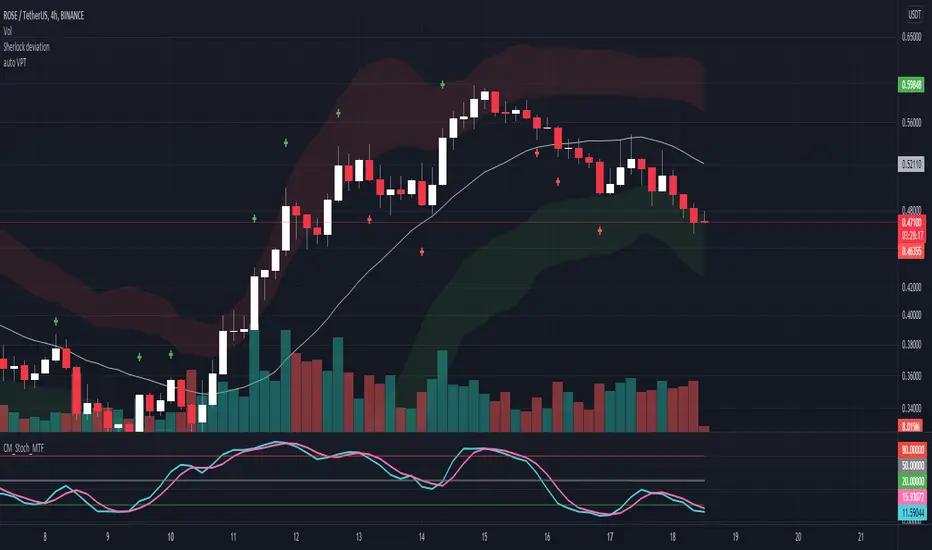 Whenever the volume of a candle is at or over 1.5 times the previous volume, it automatically places a cross on the Volume Price Target (candle range projected from the close) of the candle with abnormal volume.