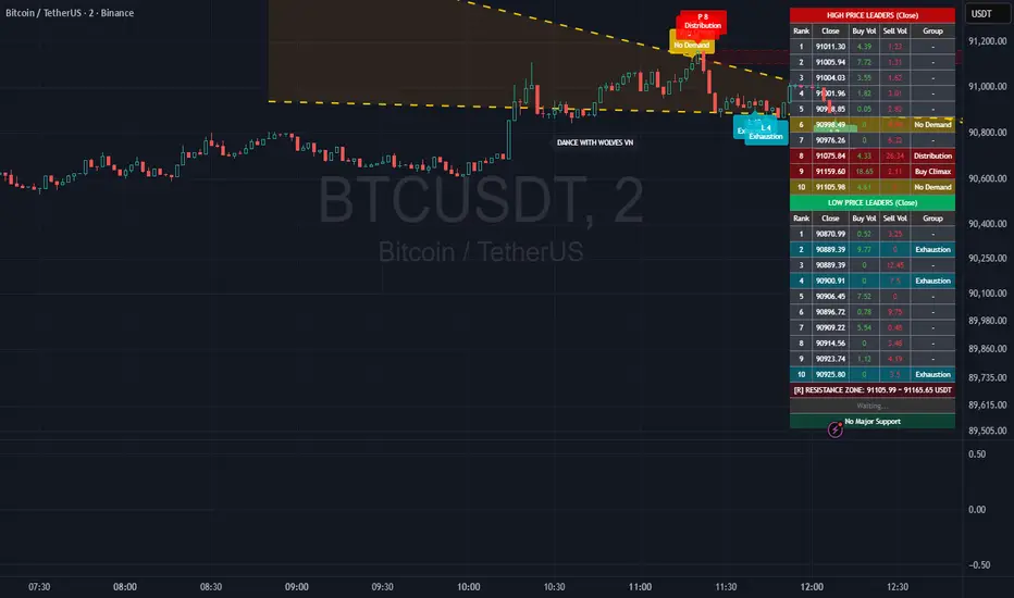 Tự động vẽ vùng hỗ trợ/kháng cự theo volume mạnh/yếu, label (Distribution, No Demand, Absorption, Exhaustion) và kênh xu hướng.
