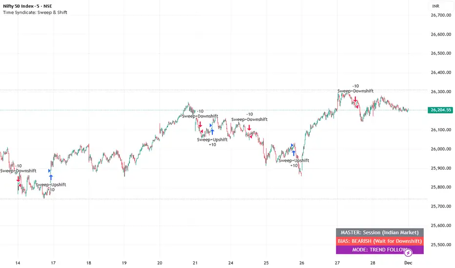Fractal Confirmation Engine: A bias is nothing without timing. The "Shift" mechanism is a secondary confirmation layer that monitors sub-structural price delivery. It validates that the momentum matches the time cycle, ensuring you only execute when Time, Price, and Structure are in perfect confluence.