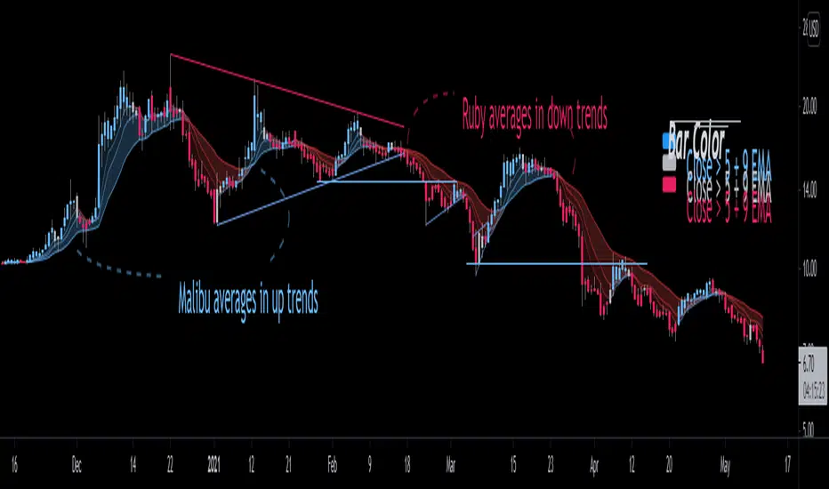 The inputs are raw and super basic. At its core its really just 3 EMAs that you can customize the source and length. The averages and shadowing change color based on if they are either rising or falling.