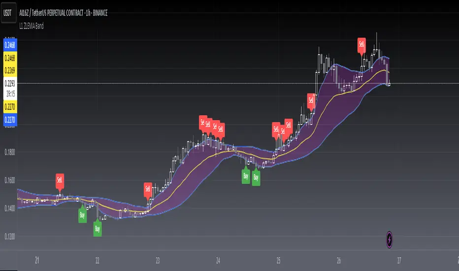 OVERVIEWThe [blackcat] L1 Zero-Lag EMA Band indicator provides a smoothed representation of price movements using a zero-lag Exponential Moving Average (EMA). This script calculates the zero-lag EMA along with its upper and lower bands, helping traders identify potential buy and sell opportunities. By plotting these bands on the chart, users can easily visualize market trends and make informed trading decisions 📈💹.